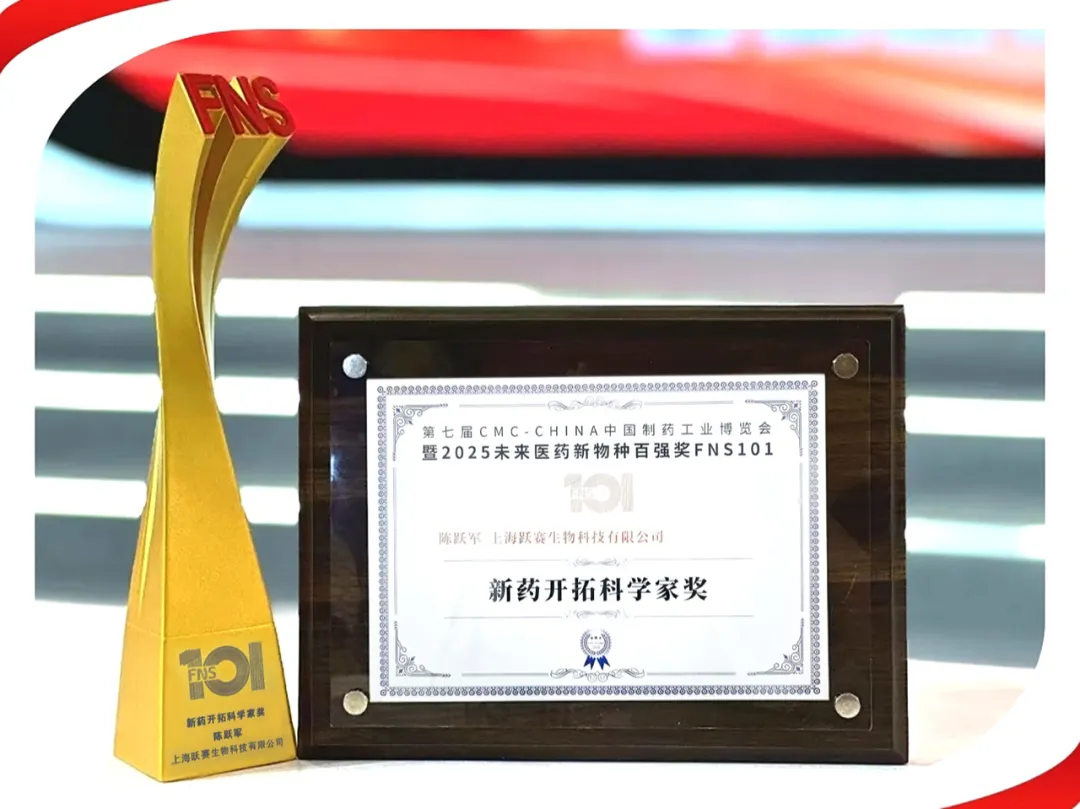 2025年8月1日,在CBI生物医药创新博览会(CBI BioPharma Innovation Expo)上,由CMC-CHINA中国制药工业博览会和药融圈和联合发起的权威榜单——《2025年中国制药工业TOP101》及10大核心产业链榜单,以及聚焦创新力量的《2025未来新物种百强奖FNS101》等6大细分奖项隆重揭晓。陈跃军教授带领的的上海跃赛生物科技有限公司团队凭借在创新药物研发领域的突出贡献,荣获备受瞩目的未来医药新物种百强奖FNS101“新药开拓科学家奖”。本次评选基于严谨的数据分析和多维度的专业评估,旨在表彰在新药开发和转化应用领域做出卓越成就的企业和科学家。